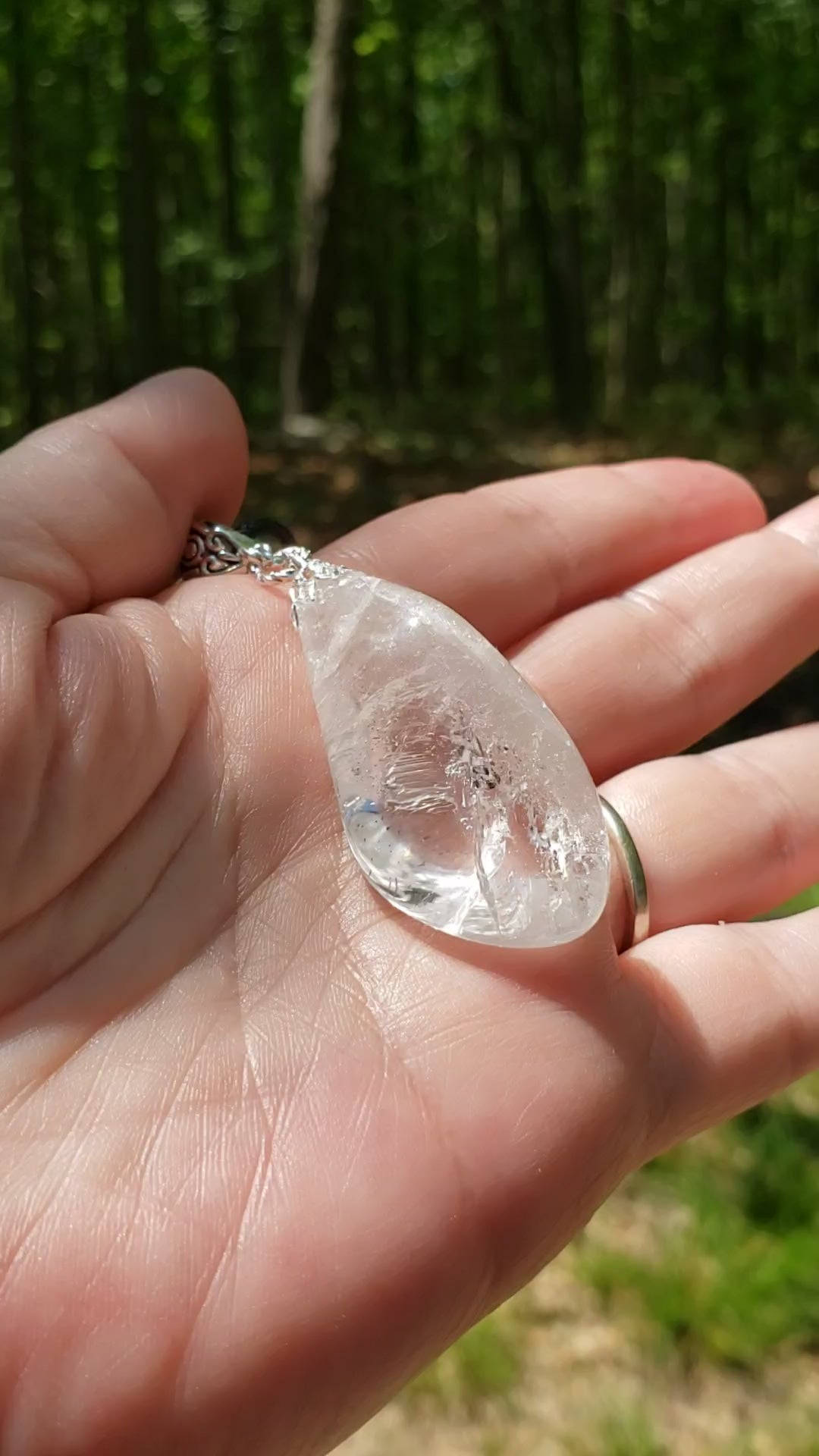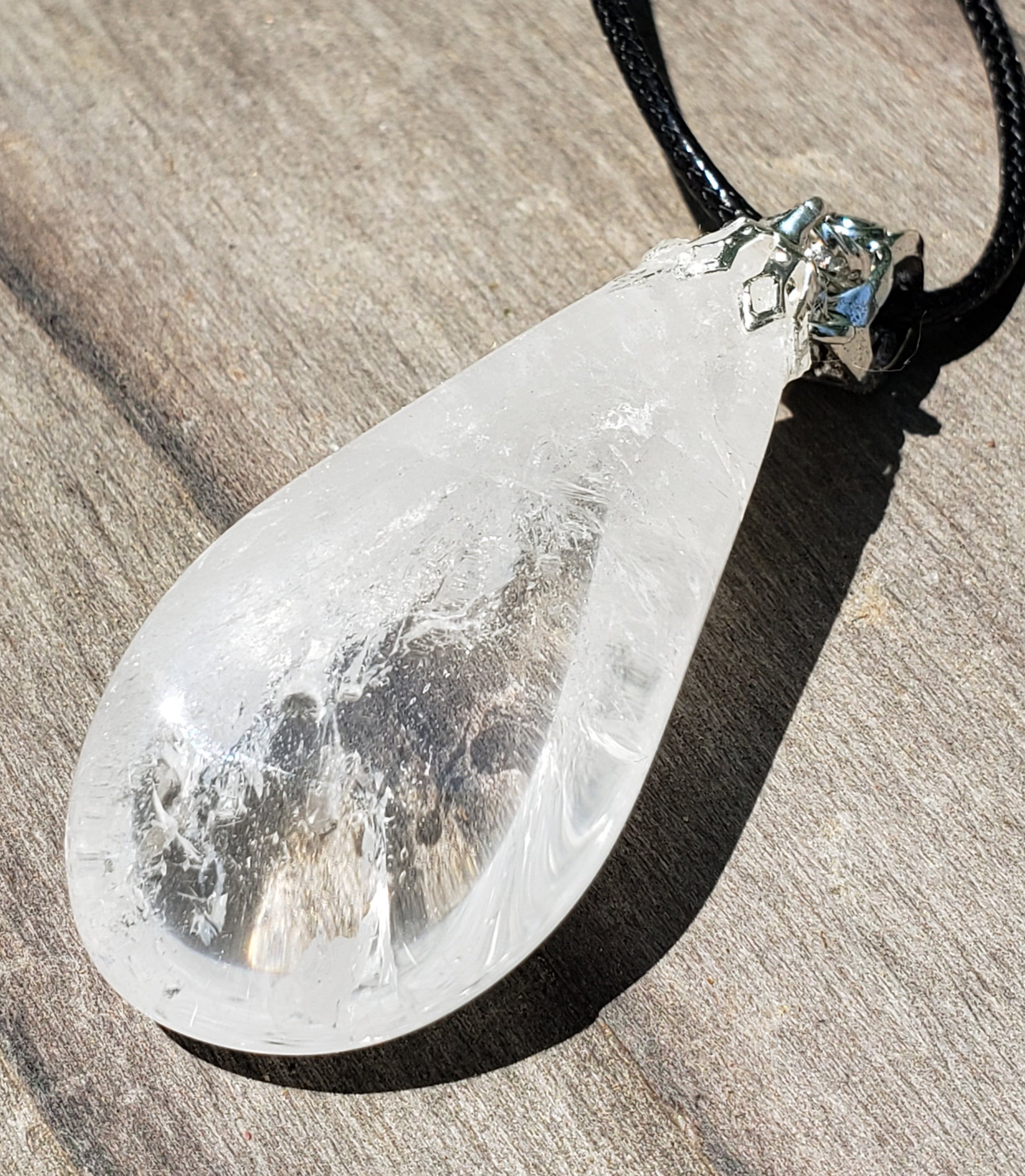Beautiful clear quartz point that we tumbled and made into a gorgeous necklace. Quartz is approximately 1 5/8 inches long and 2 1/2 inches if you count the bail. Comes on a black cord approximately 18 inches long with an additional 1 3/4 inch extender chain.