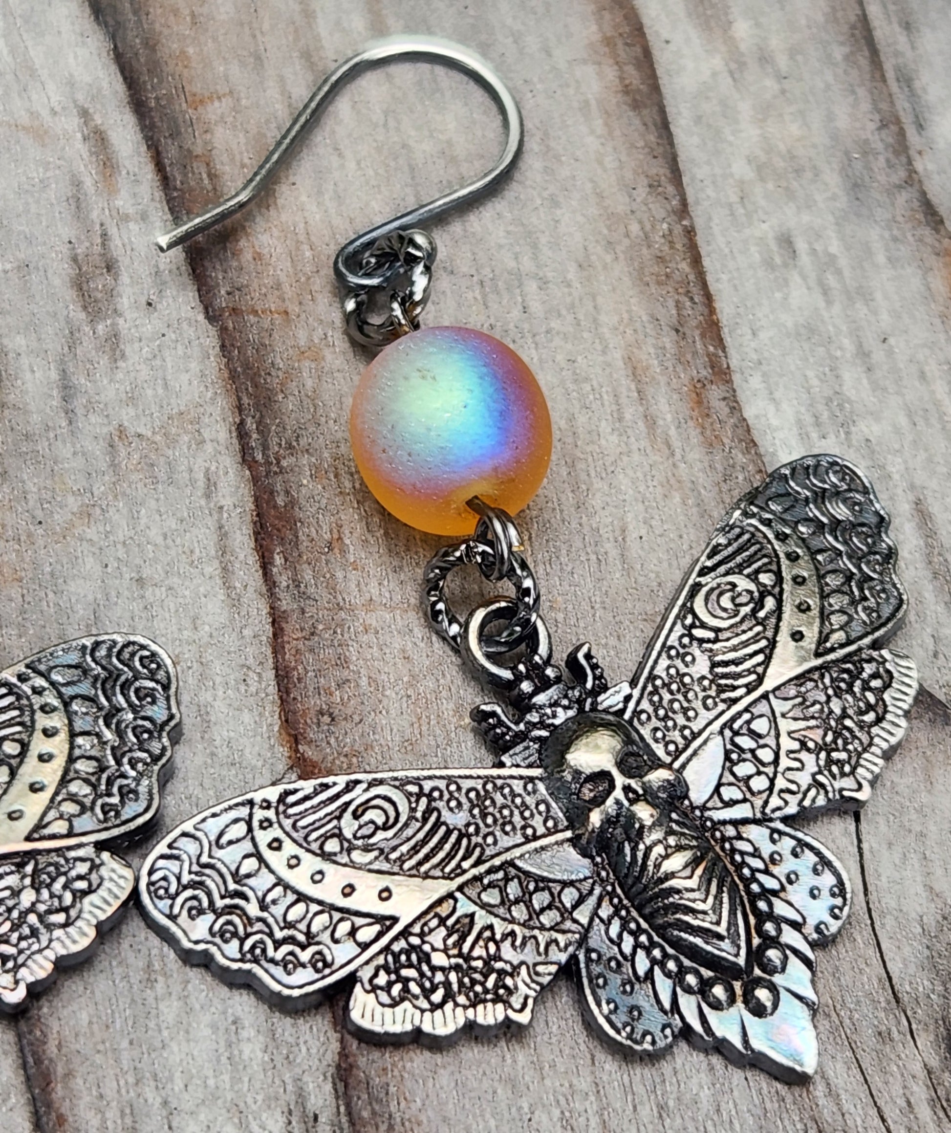 Death’s-Head Moth Earrings with Orange Glass Beads. Darkly elegant with a touch of iridescent magic, these Death’s-Head Moth Earrings blend gothic mystery and ethereal glow. Each detailed slightly hand oxidized moth charm features intricate filigree wings and a tiny skull motif, hanging beneath frosted aura glass beads that shift between warm amber, lilac, and soft blue tones in the light.