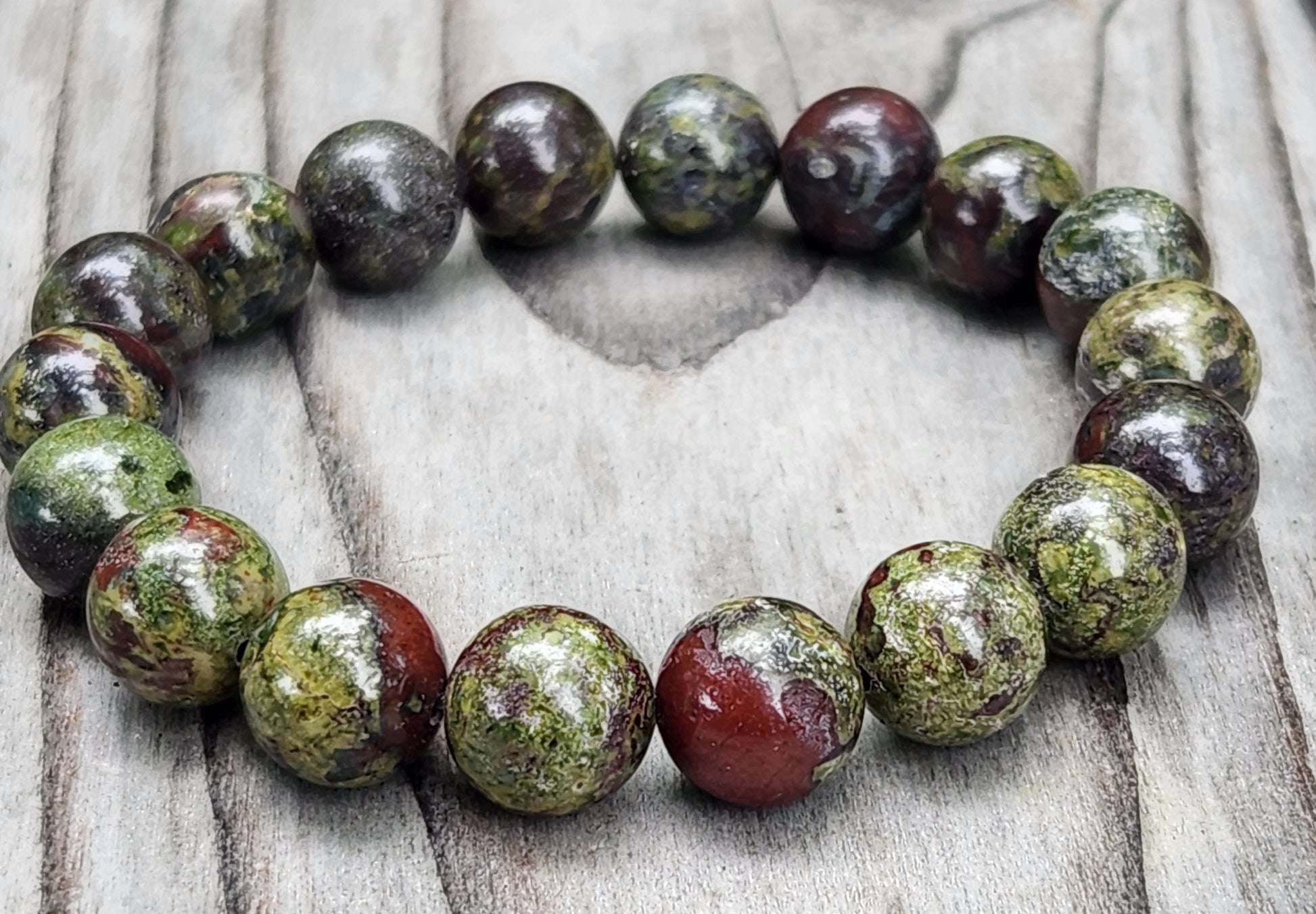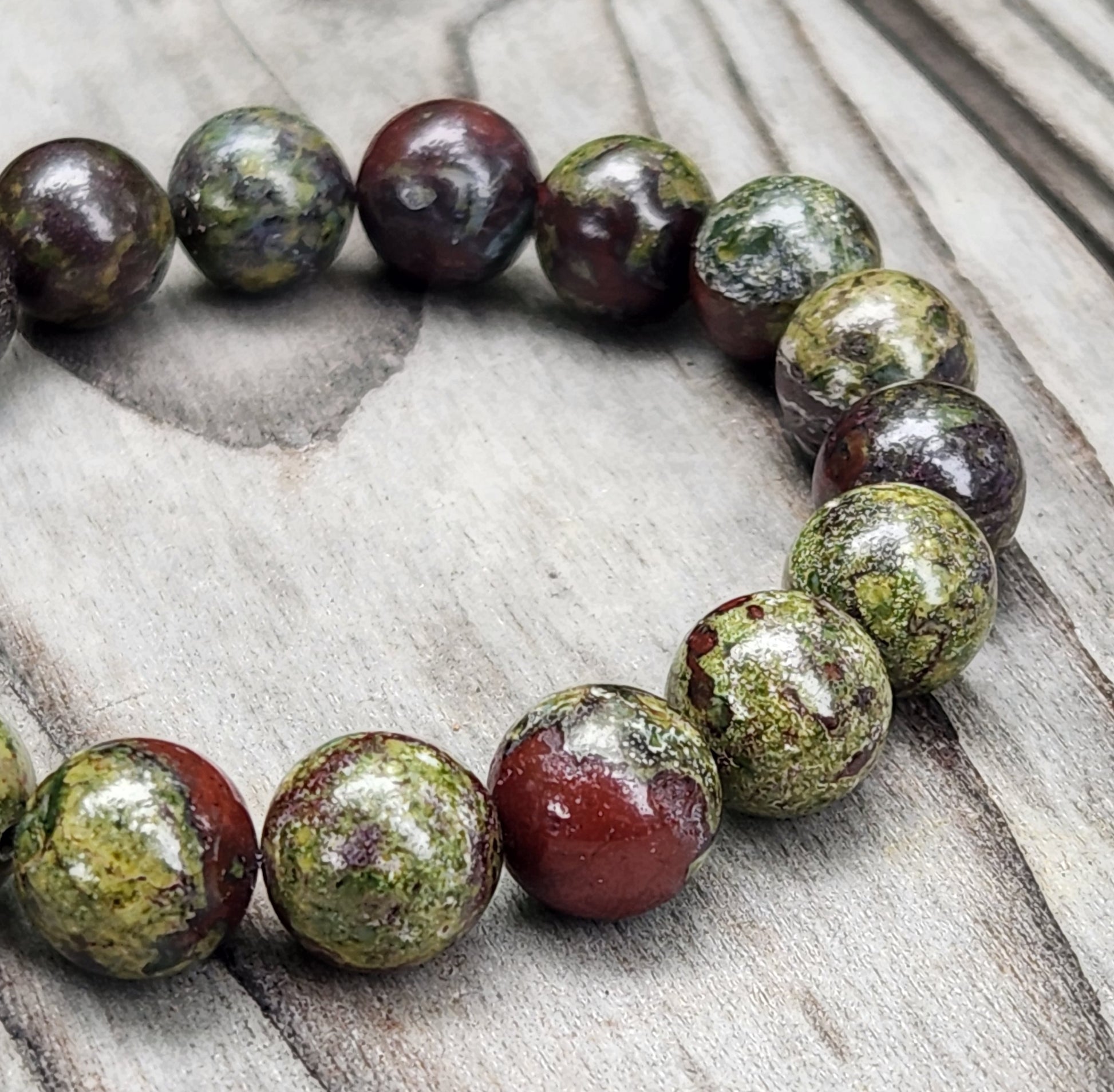 Dragon’s Blood Jasper Bracelet. Earthy, bold, and full of ancient energy, this Dragon’s Blood Jasper bracelet combines deep crimson reds with rich forest greens in a striking natural pattern. Each 10mm bead is polished to a smooth, glossy finish, revealing the stone’s unique swirls and mottled colors that look almost alive. Named for its fiery red veins and grounding green base, Dragon’s Blood Jasper is believed to awaken inner strength and vitality while keeping you balanced and protected.