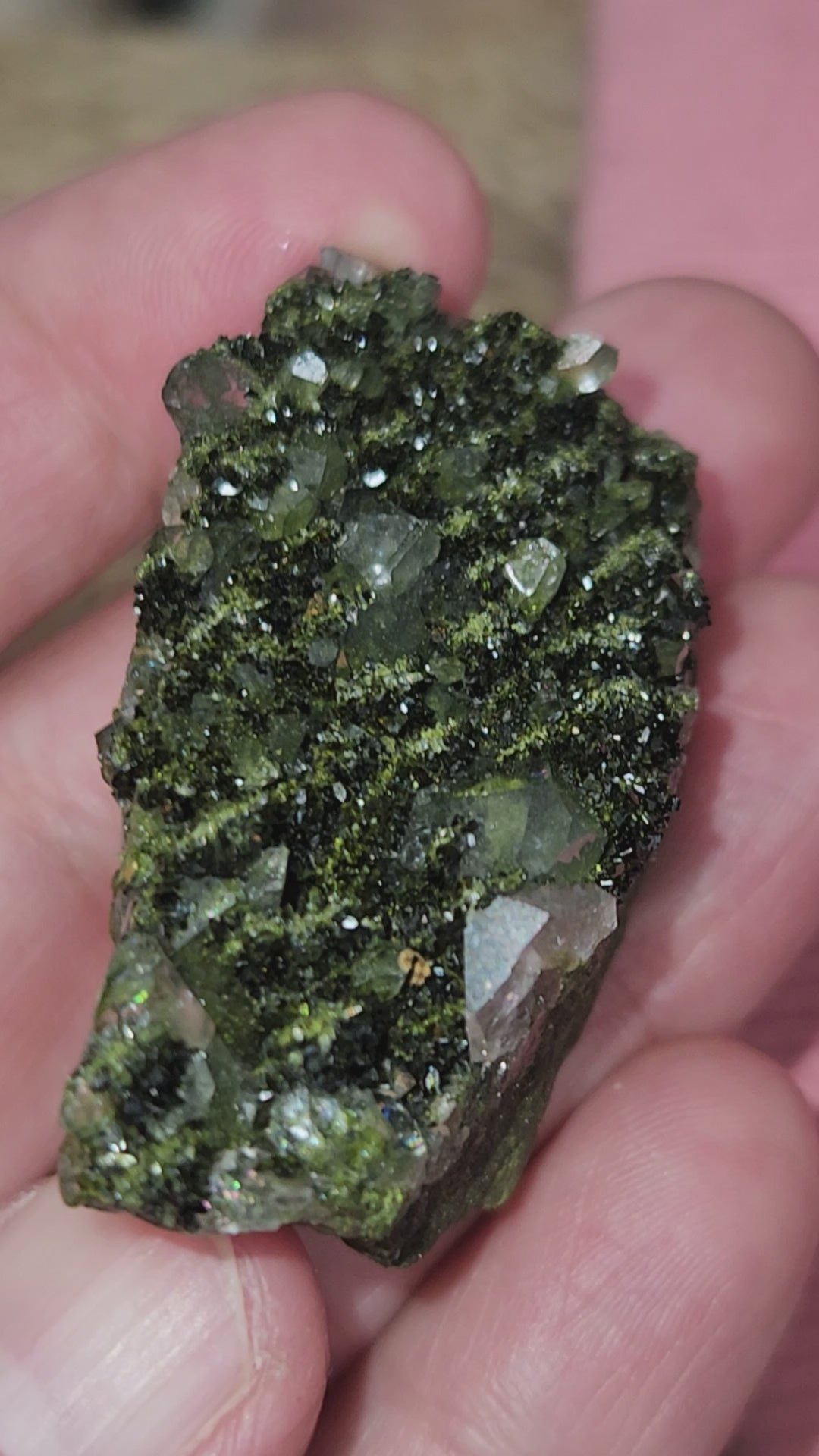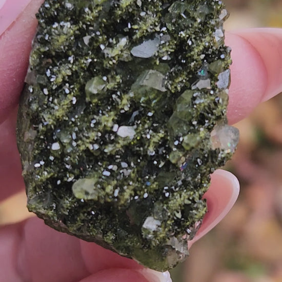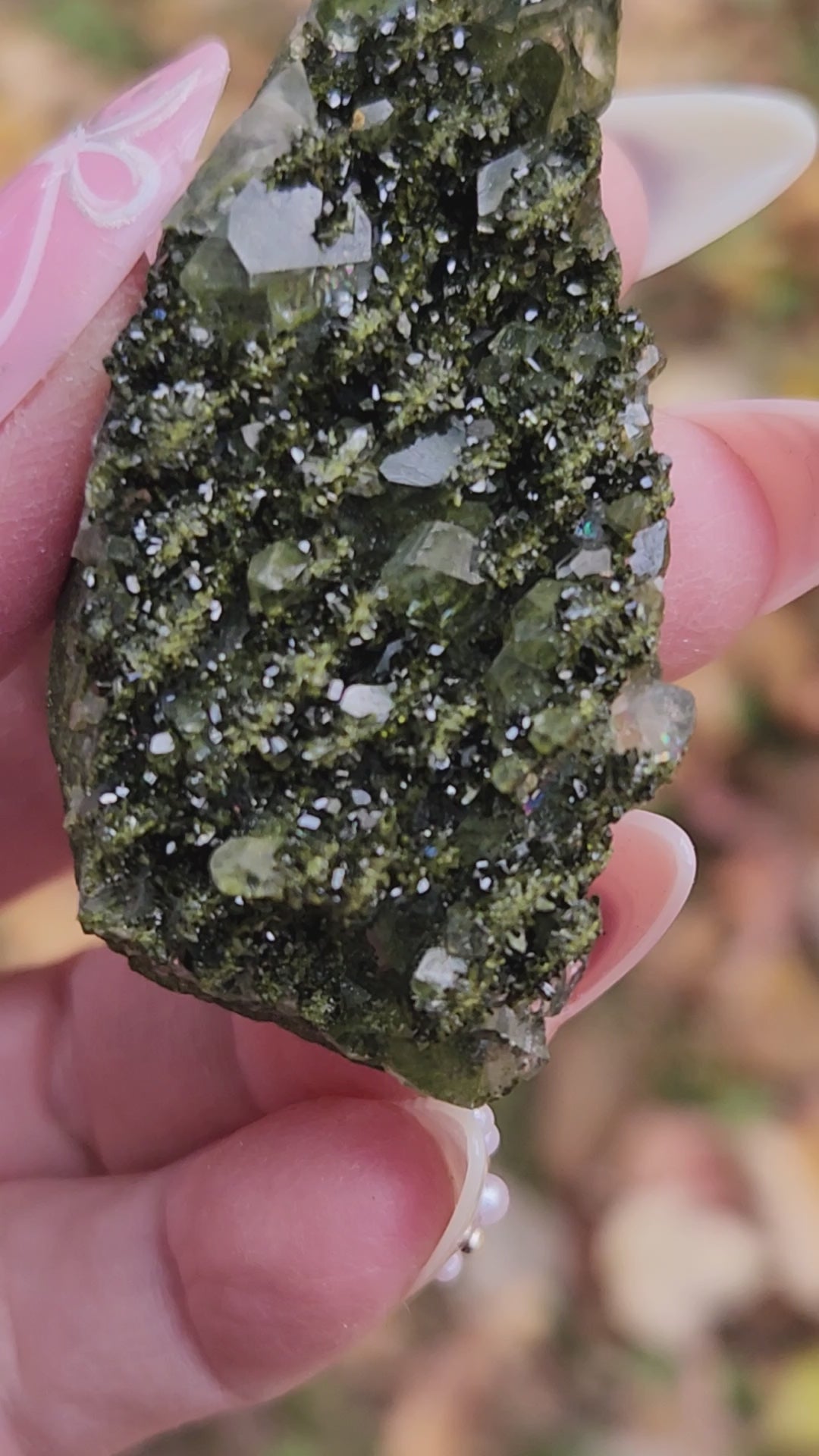 Item#SP464 - Approximately 2 1/4 inches. Dark-olive epidote with micro-quartz inclusions that create a mirror-like sparkle. Dense, compact, and highly reflective — an eye-catcher under any lighting.