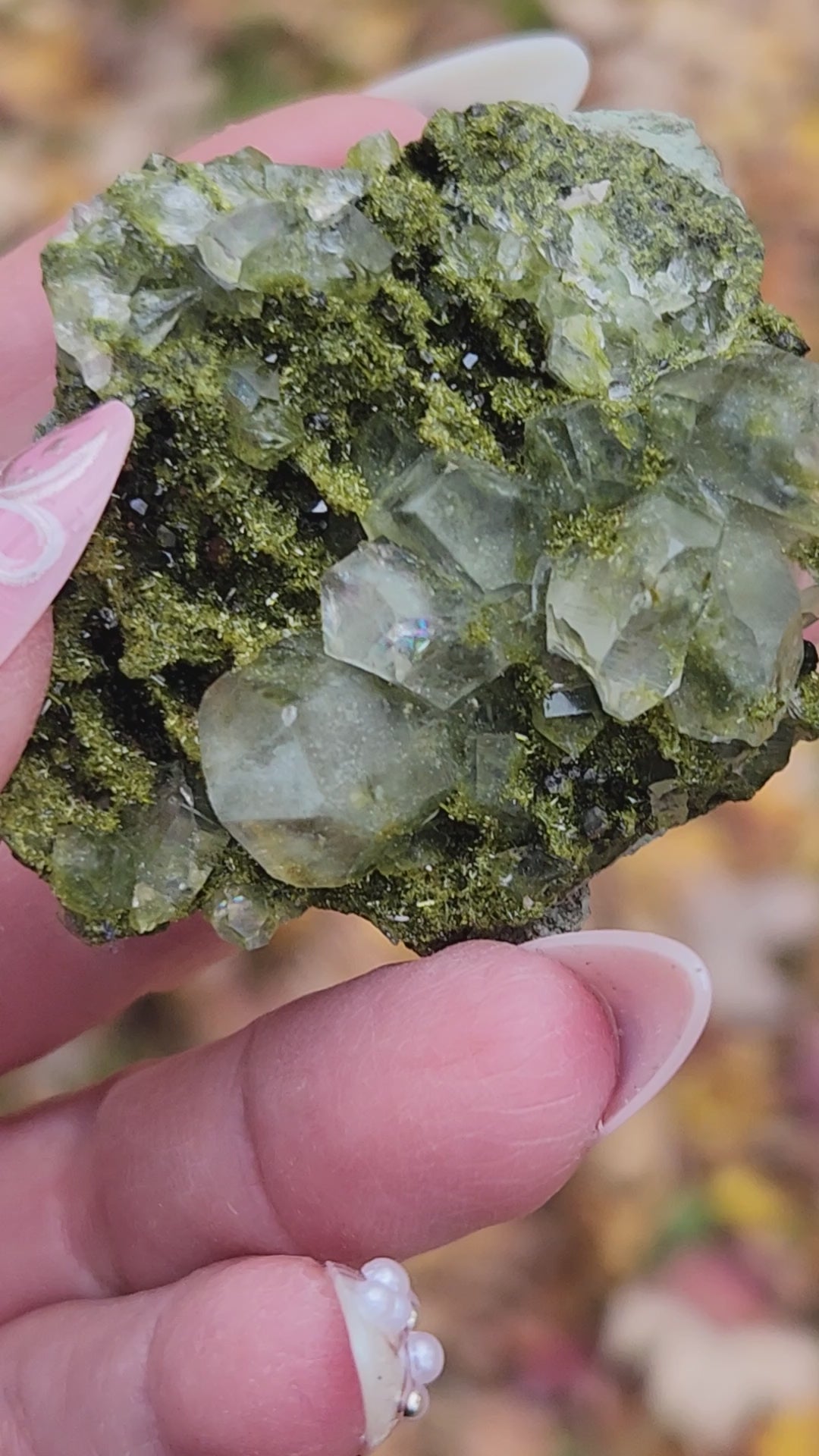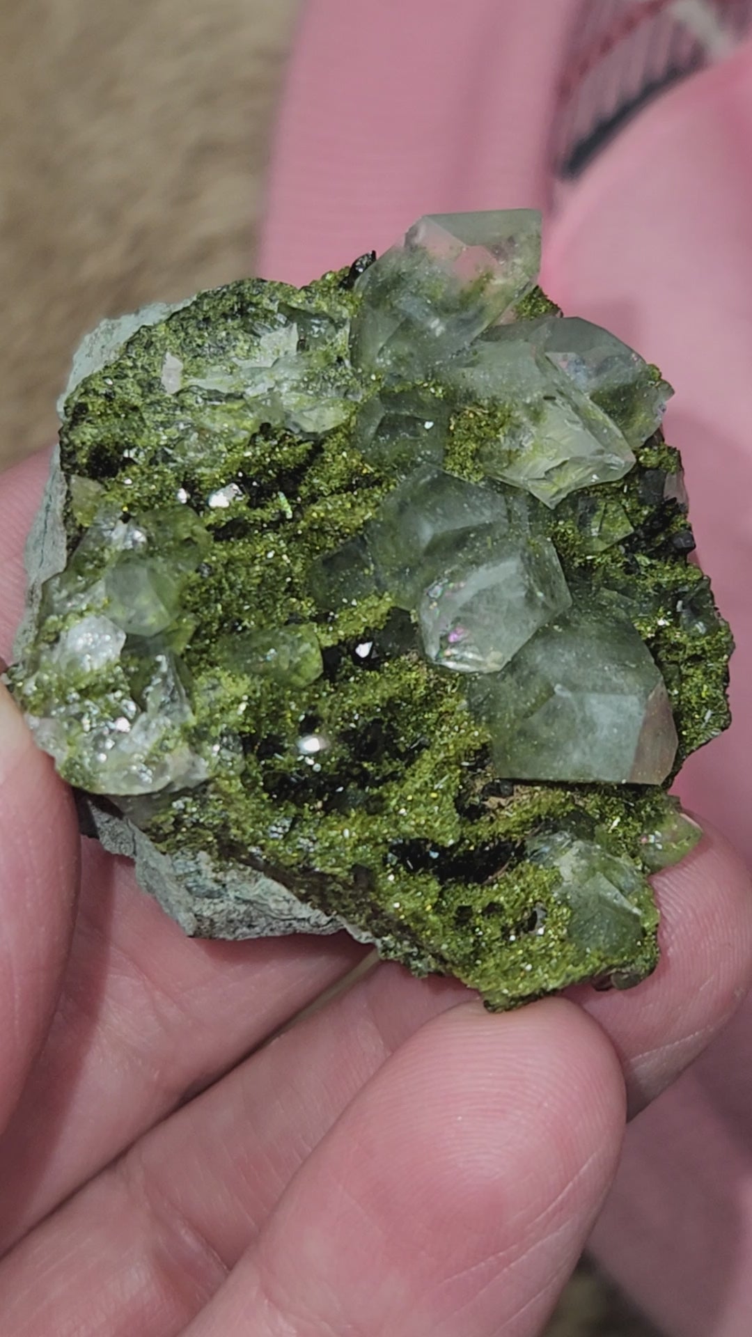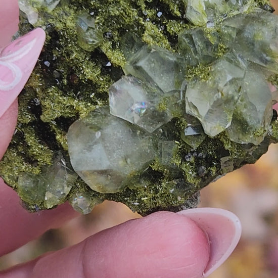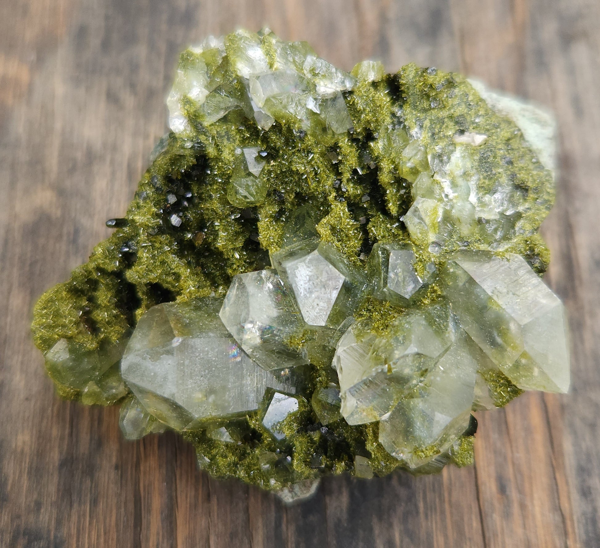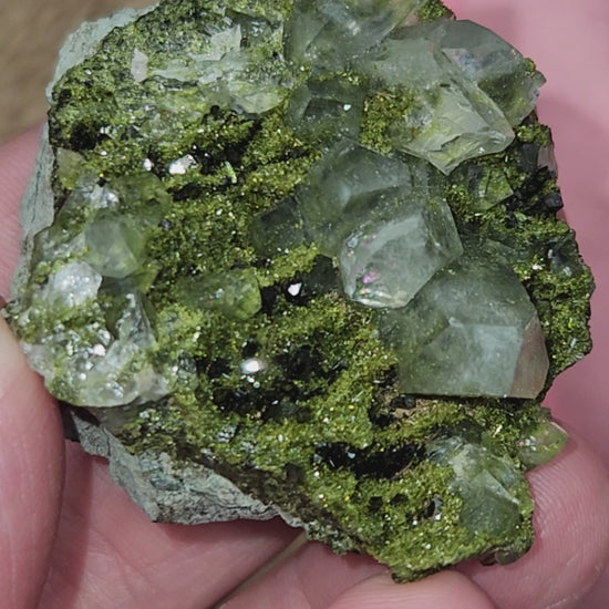 Discovered high in the mountains of Hakkari Province in southeastern Turkey, these extraordinary crystals—often called Forest Epidote or Fairy Forest Epidote—are celebrated for their vibrant green color, metallic sheen, and intricate drusy texture.