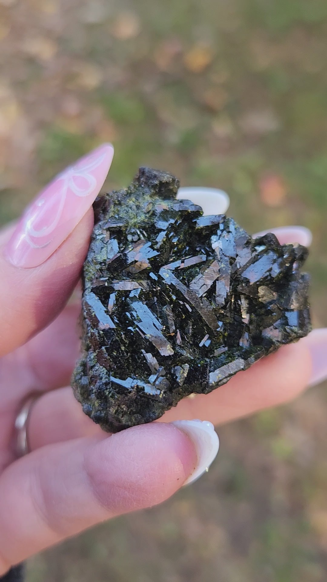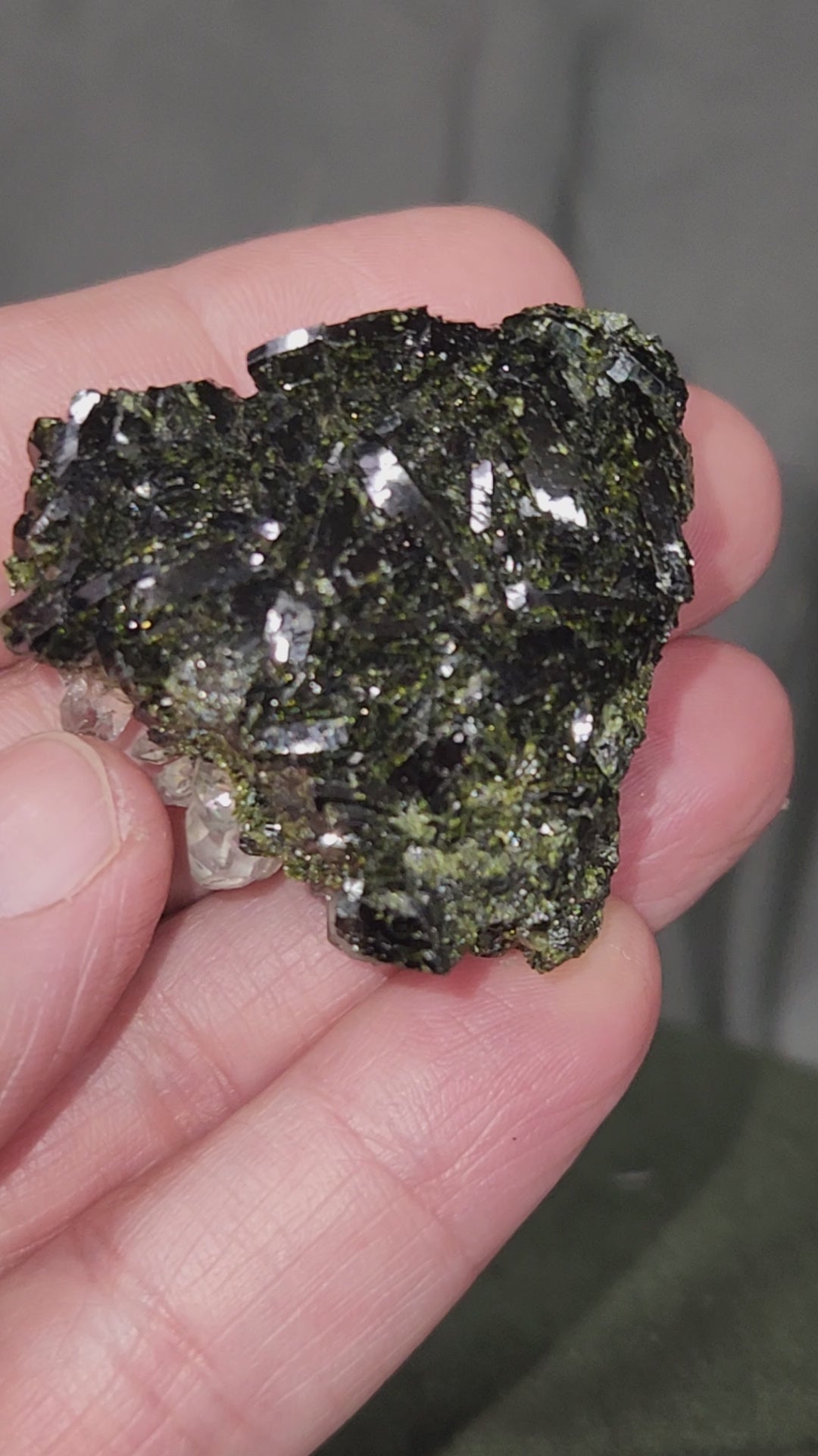 Item#SP473 - Approximately 1 3/4 inches but thick. Dense, dark epidote loaded with micro-terminated crystals and gleaming quartz points. Metallic flash and substantial heft make this a premium collector’s piece.