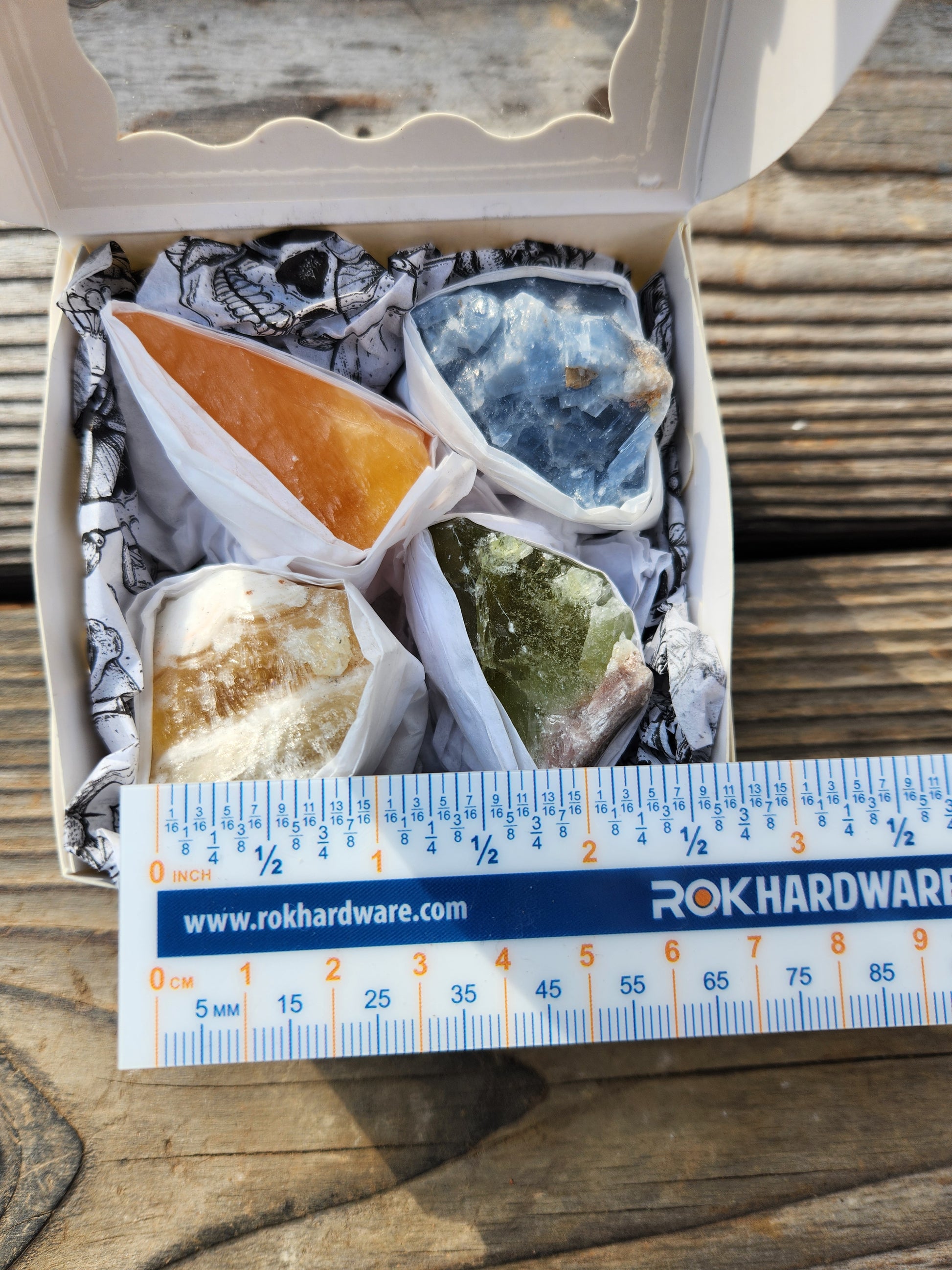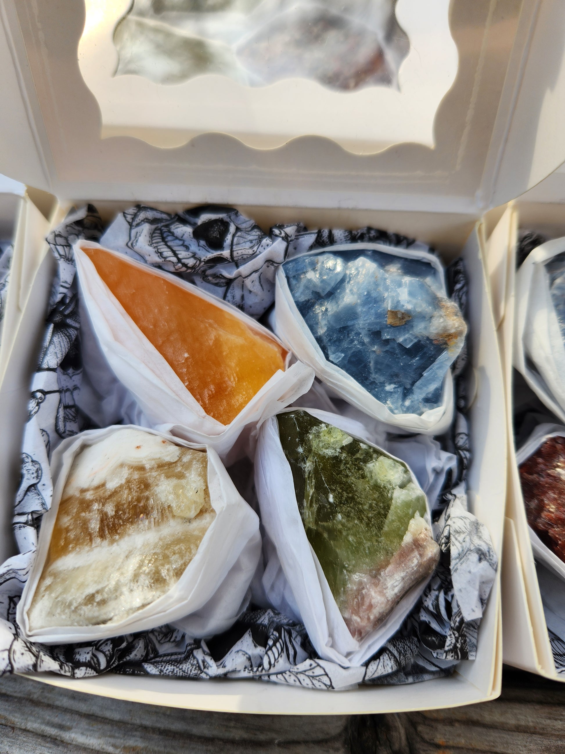 These adorable Calcite "Candy" Boxes are pure eye-candy (not mouth candy š) packed with four beautiful raw calcite chunks in different natural colors. Each piece is wrapped individually in tissue like little gemstone treats, nestled inside a window gift box so the colors peek through like sweets in a confectionery display. Some pieces may be UV Reactive. Randomly pulled for you.