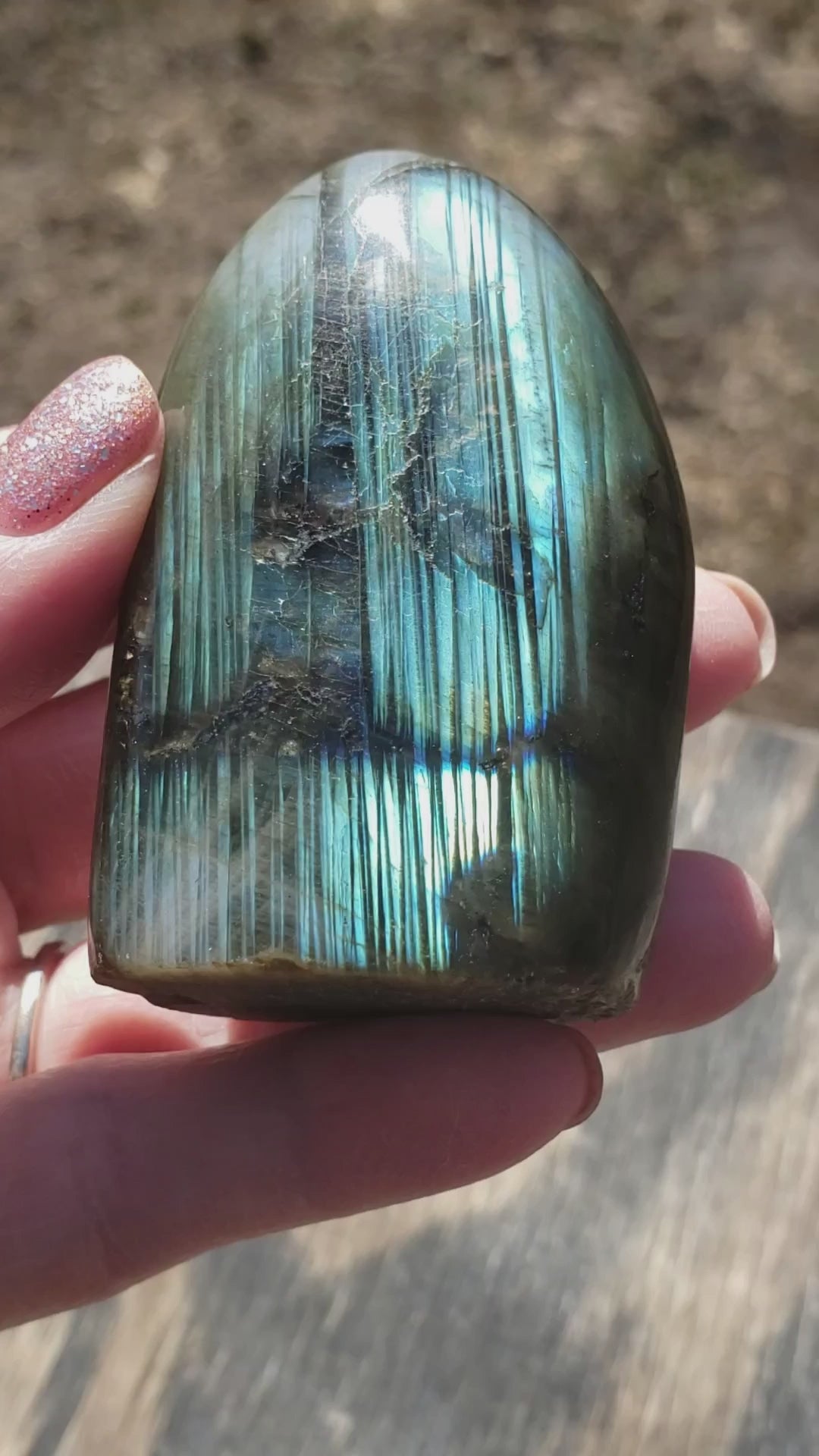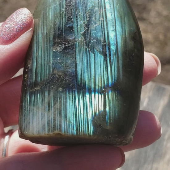 This polished Labradorite freeform displays a beautiful blue and teal flash that shimmers across the surface when it catches the light. Natural internal striations create a curtain-like effect, highlighting labradorite’s signature labradorescence and giving the stone depth and movement.