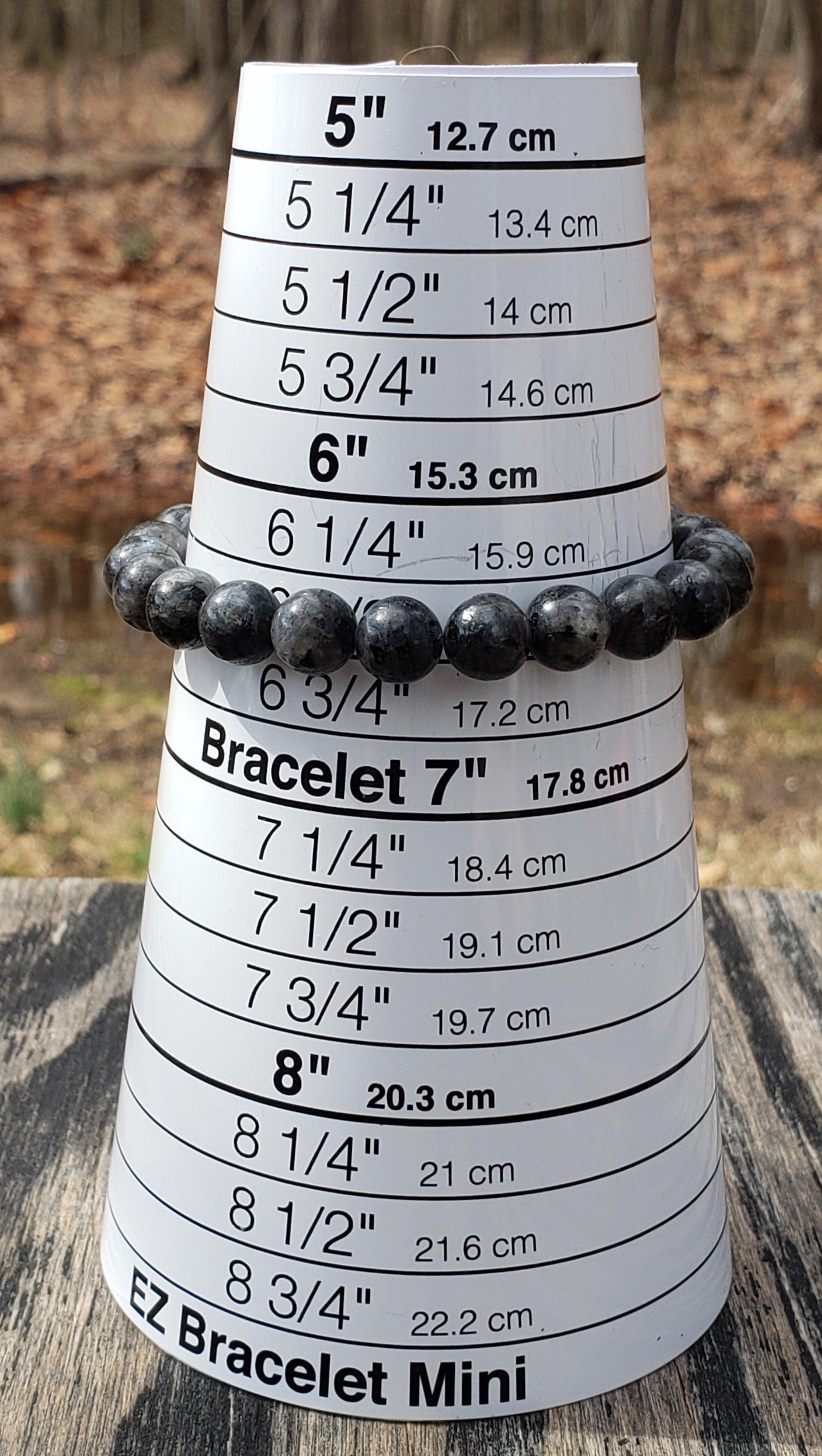 Beautiful Larvikite stretch bracelet, with shimmery grey black flashy beads. Think Labradorite, but moody. Approx 6 1/2 inner diameter. Handmade by BC Crystals and Rocks! Item #JL17