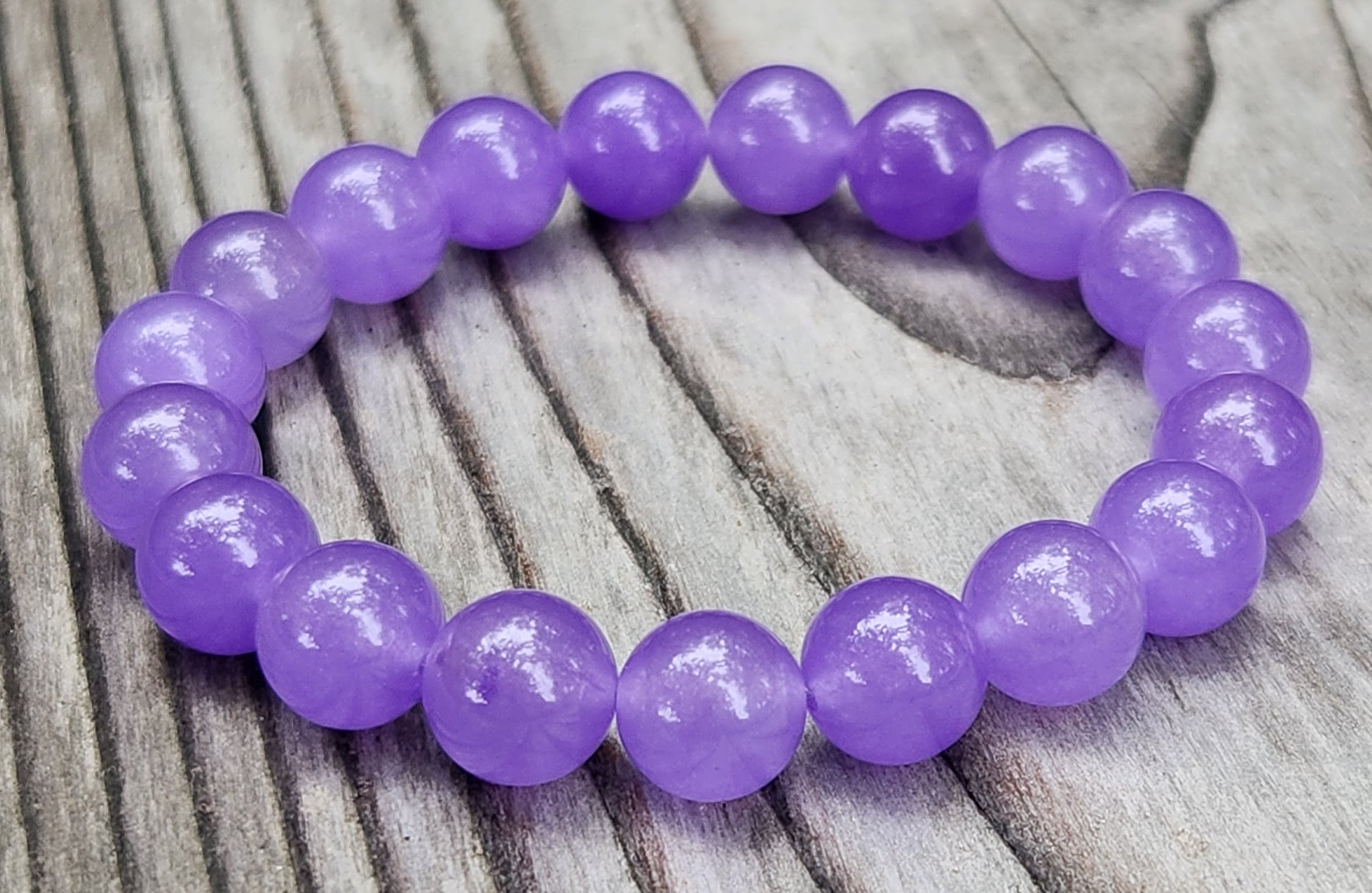 Soft and serene, this Lavender Quartz bracelet glows with a calming purple hue and a luminous glossy finish. Each 10mm bead is made of natural quartz that’s been permanently dyed and polished to a mirror-like shine, giving it a dreamy, glassy look that catches the light beautifully.