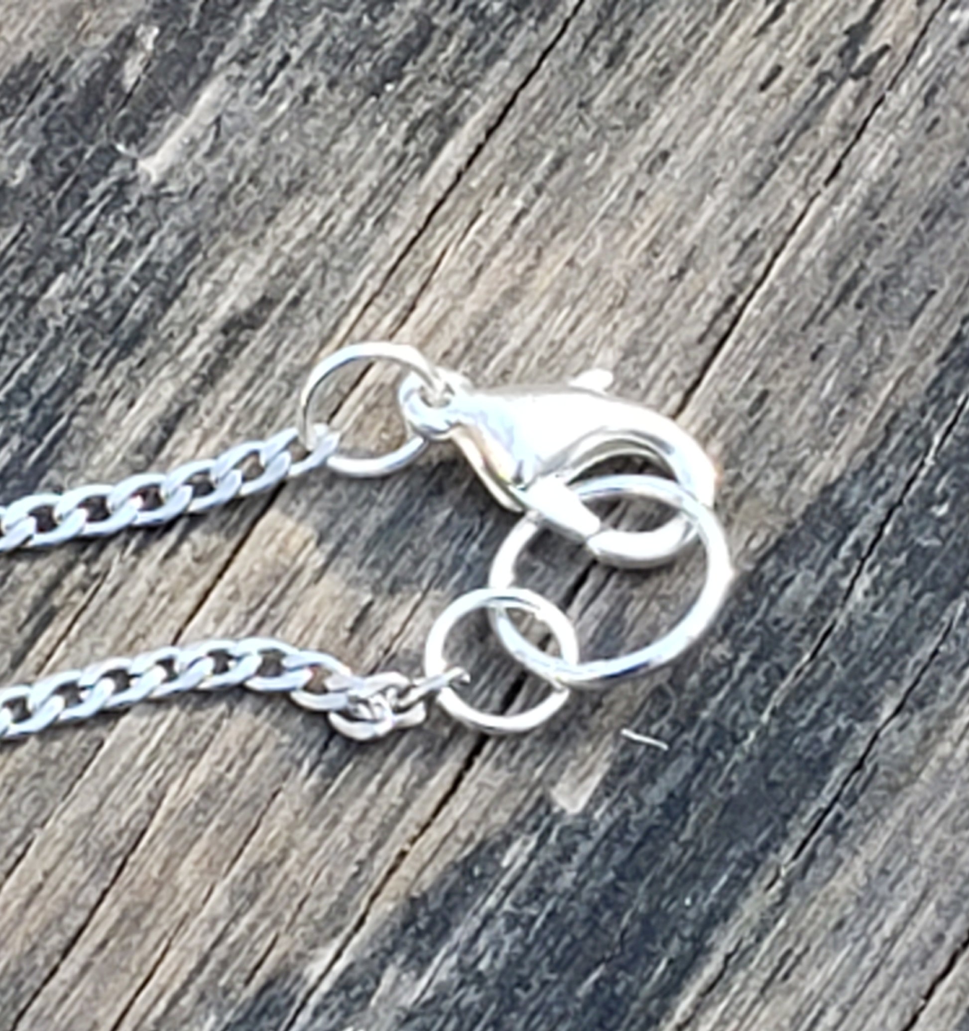 Chain is stainless steel and approx 18 1/2 inches long with a lobster claw closure.