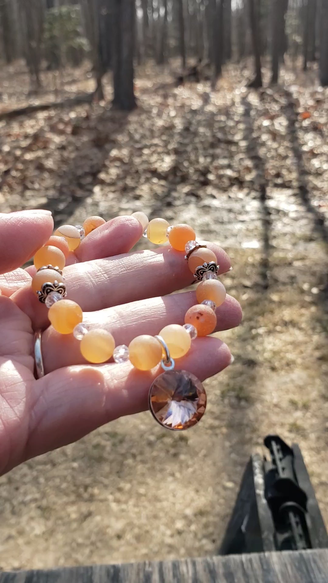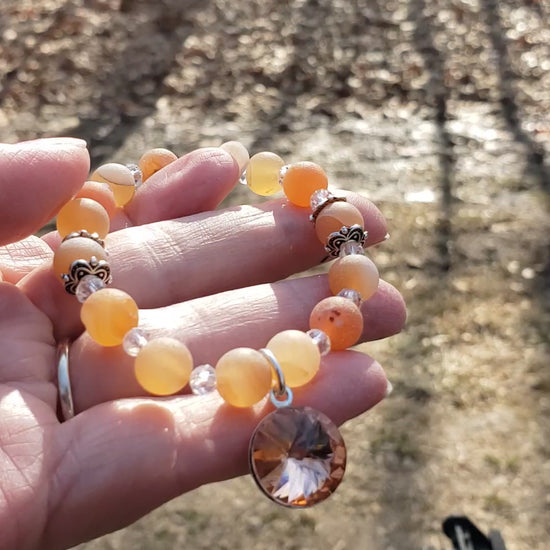 Beautiful stretch bracelet handmade by BC Crystals and Rocks, featuring peach agate beads (more then likely dyed) , clear glass beads, silver color spacers and a beautiful sparkling peach color glass rivoli charm. On the small side with a inner diameter of approximately 6 to 6 1/4th inches. Please watch the video to see how shiny the charm is!