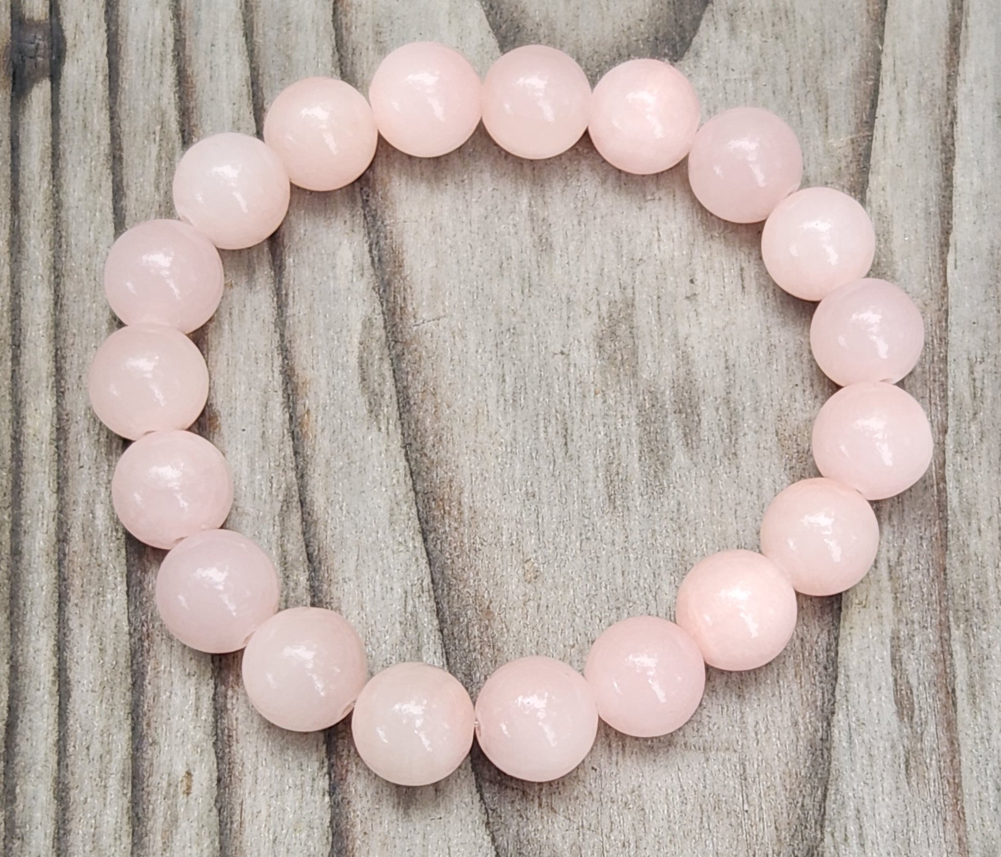 Soft, dreamy, and full of gentle energy — this Pink Mountain Jade bracelet glows with a delicate blush tone that feels soothing and feminine. Each 10mm bead has a smooth, polished finish with a subtle pearly sheen. Though known as Mountain Jade, this stone is actually a fine-grained dolomite marble that has been permanently dyed and sealed to preserve its beautiful color and glossy surface.