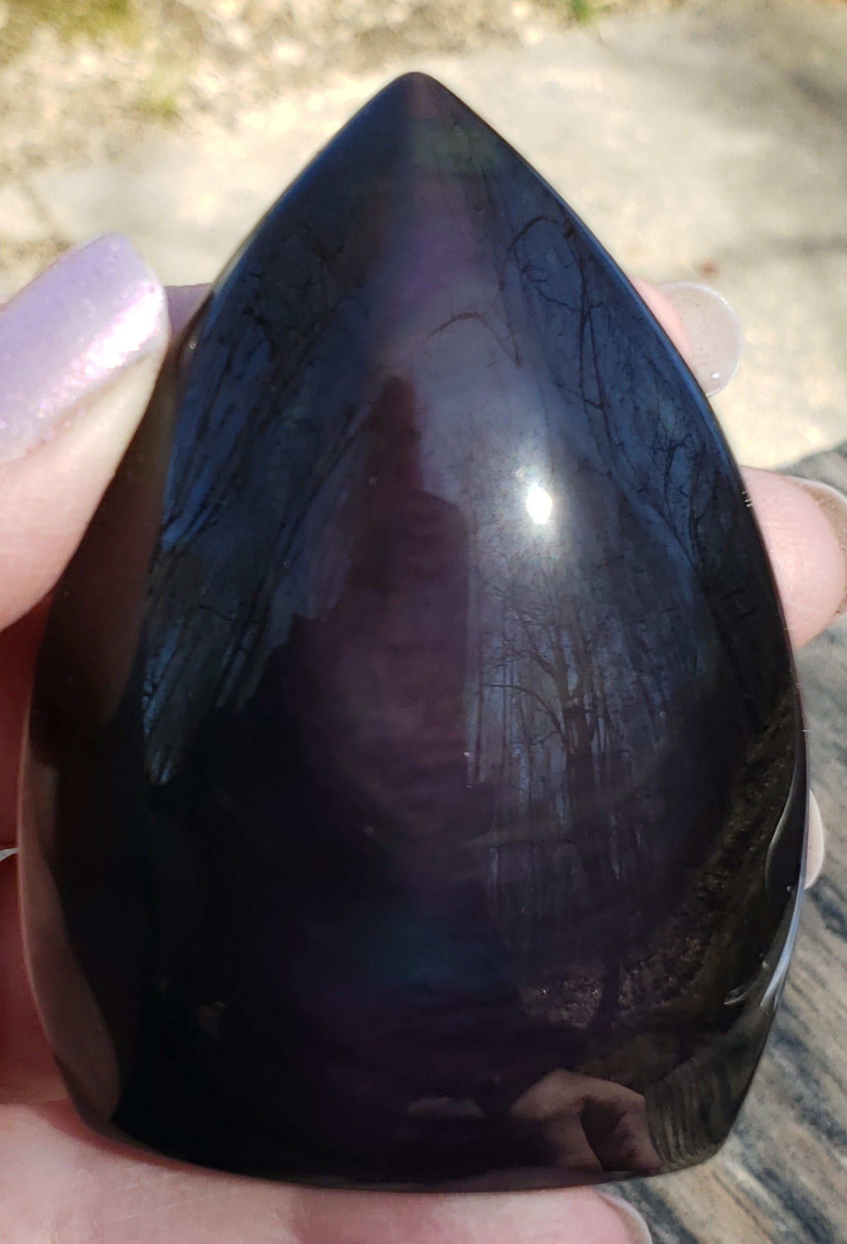 Stunning Rainbow Obsidian flame / free form with a mainly purple flash. Approx 2 5/8th inches tall by 1 3/16th inches deep. Weighs 4.41 ounces. Has a little imperfection near tip, please see picture with arrow. Item#FF135. Check out the video for the flashy parts!