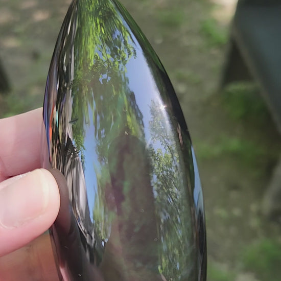 Rainbow Obsidian flame / free form. Approx 3 1/2 inches tall by 1 inches deep (front to back) Weighs 4.97 ounces. Has a small imperfection, please see picture. Item#FF136. Check out the video for the flashy parts!