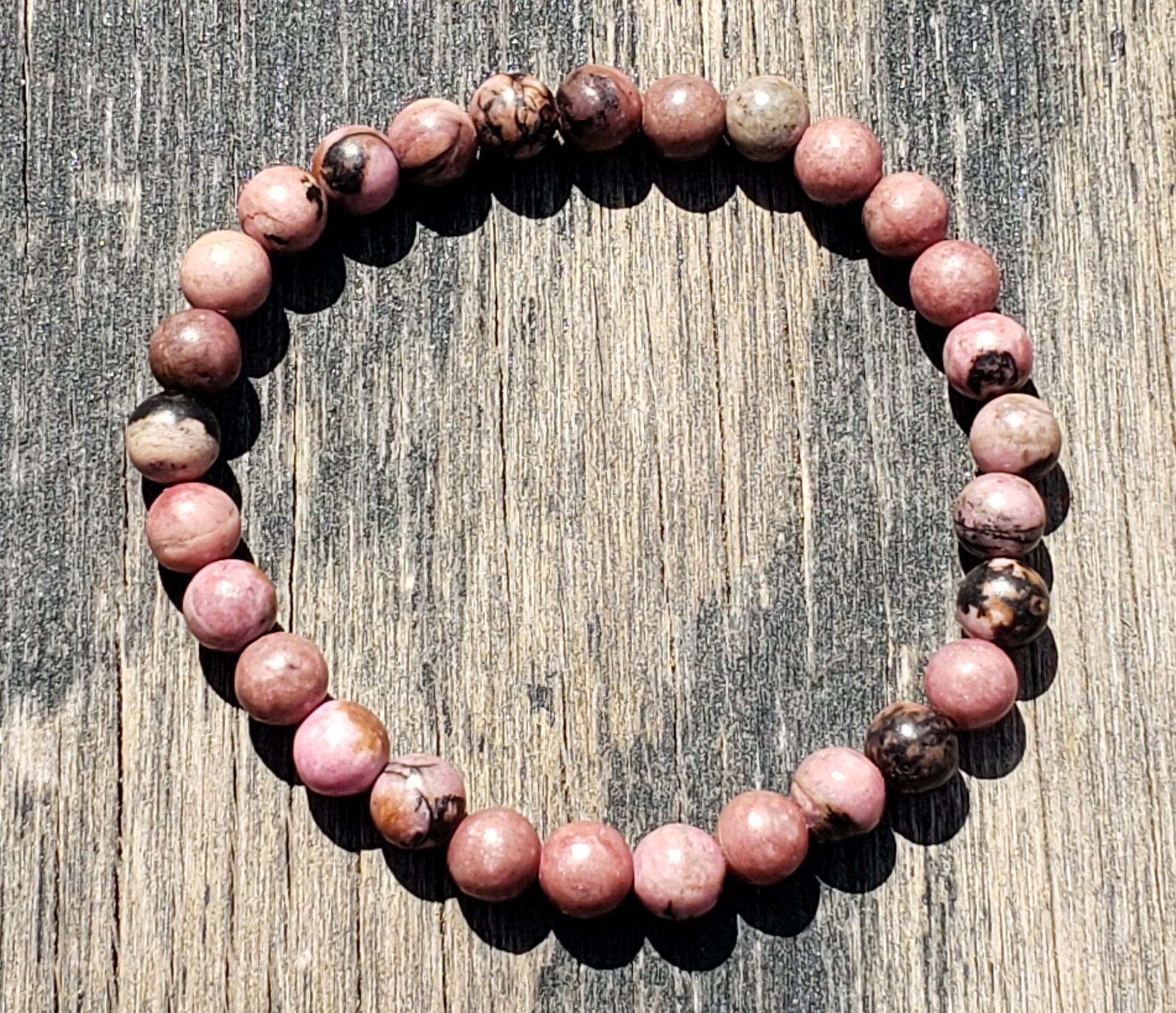 This stretch bracelet is crafted from genuine Rhodonite beads, showcasing shades of soft pink mixed with earthy browns and black inclusions. Known as the stone of compassion, Rhodonite is said to encourage love, emotional balance, and healing of the heart.