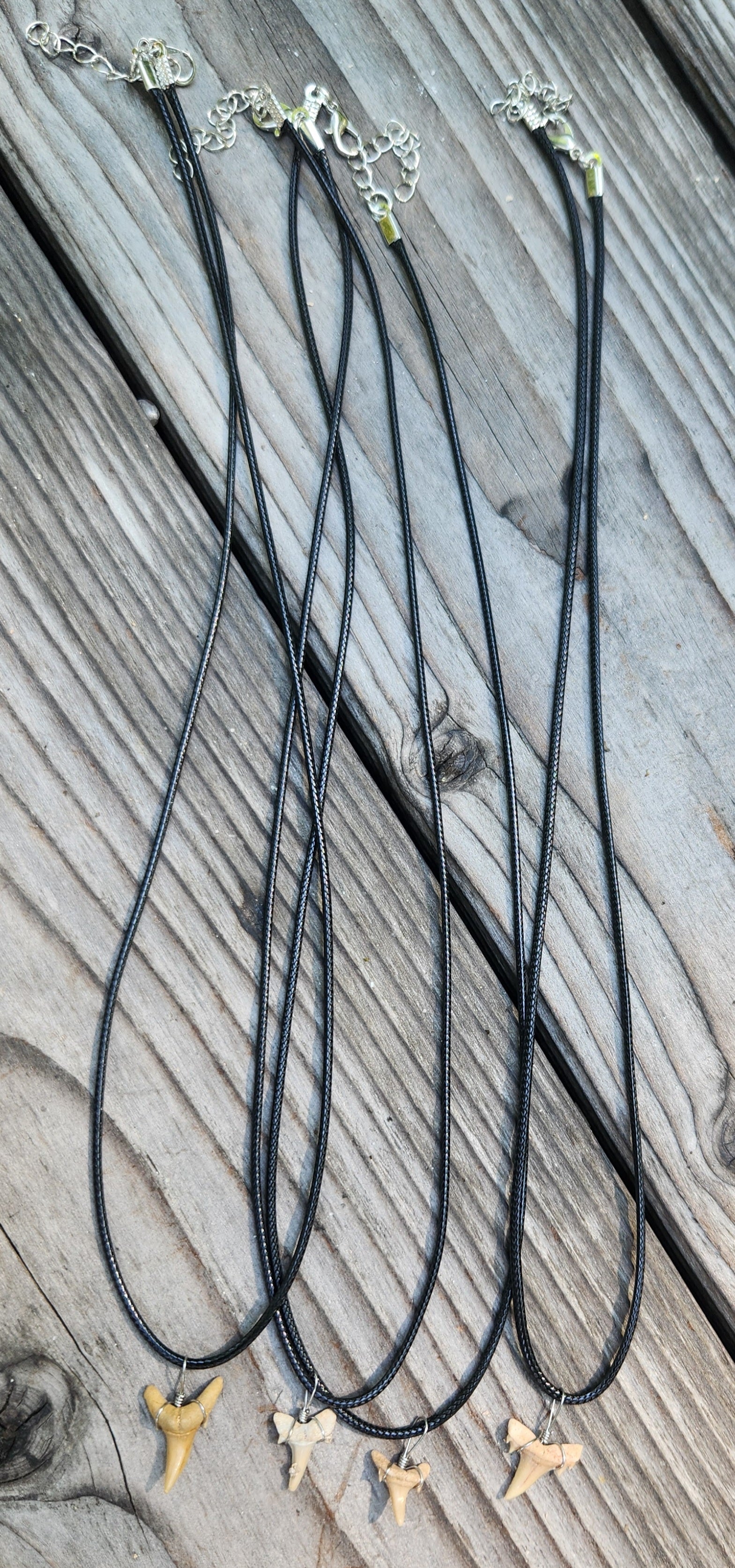 Sharks Tooth Necklace, teeth range from 15 to 25mm. They are fairly small teeth but very nice shape. Please see pictures for size references. Comes on a black cord approximately 20 inches long with an additional 1 3/4 inch extender chain. Randomly pulled.