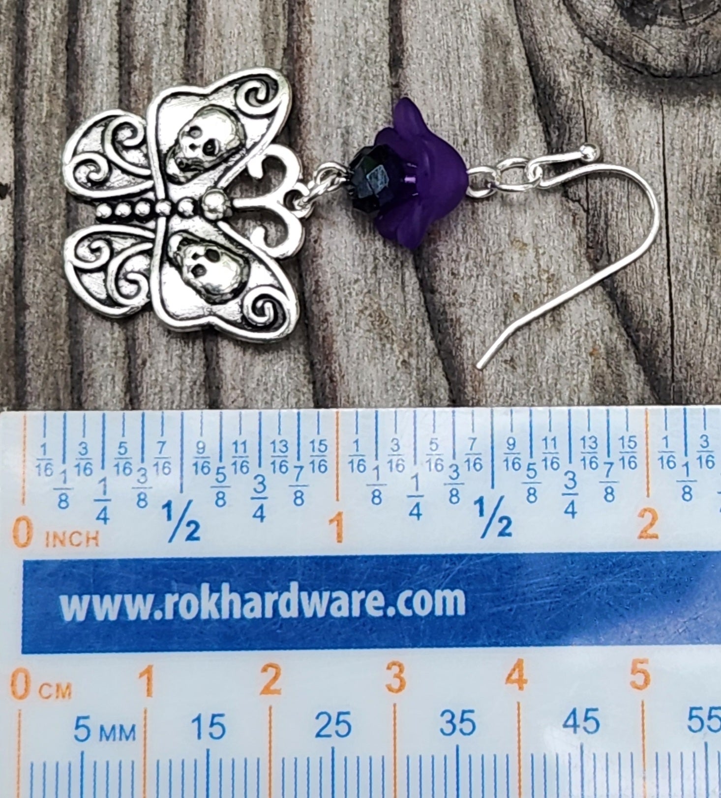 Gothic Butterfly Skull and Purple Flower Sterling Silver Earrings Item JL445