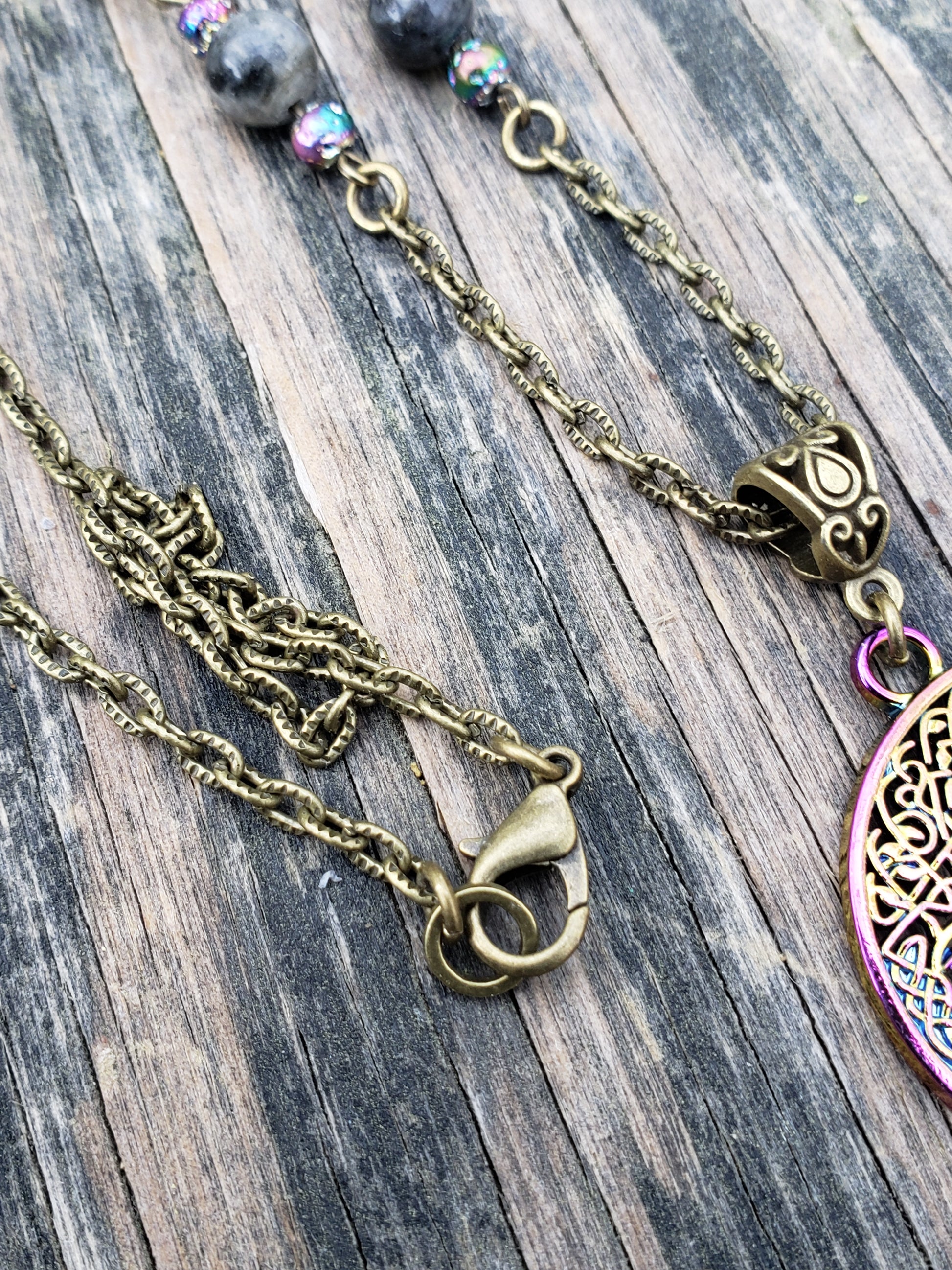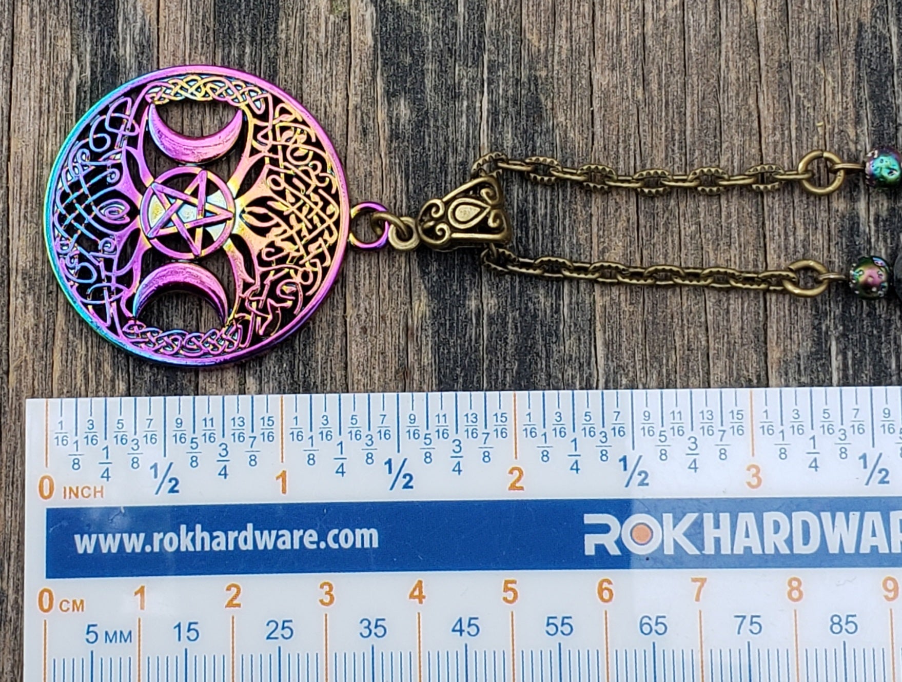Gorgeous rainbow plated triple moon wiccan pagan necklace made with a stainless steal charm, larvikite and electroplated lava gemstone beads. Antiqued bronze colored iron chain. Approx 20 1/2 inches long with a lobster claw clasp. Only 1 available! Item#JL221